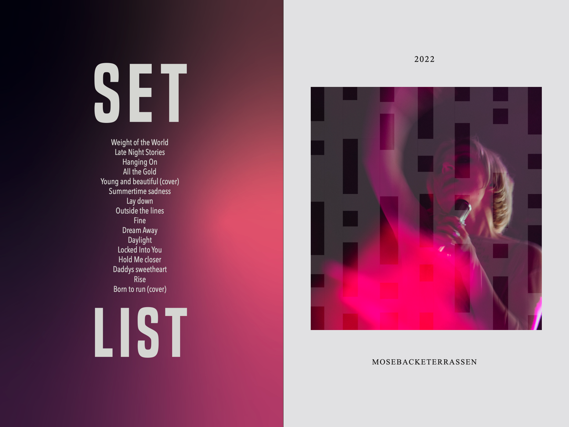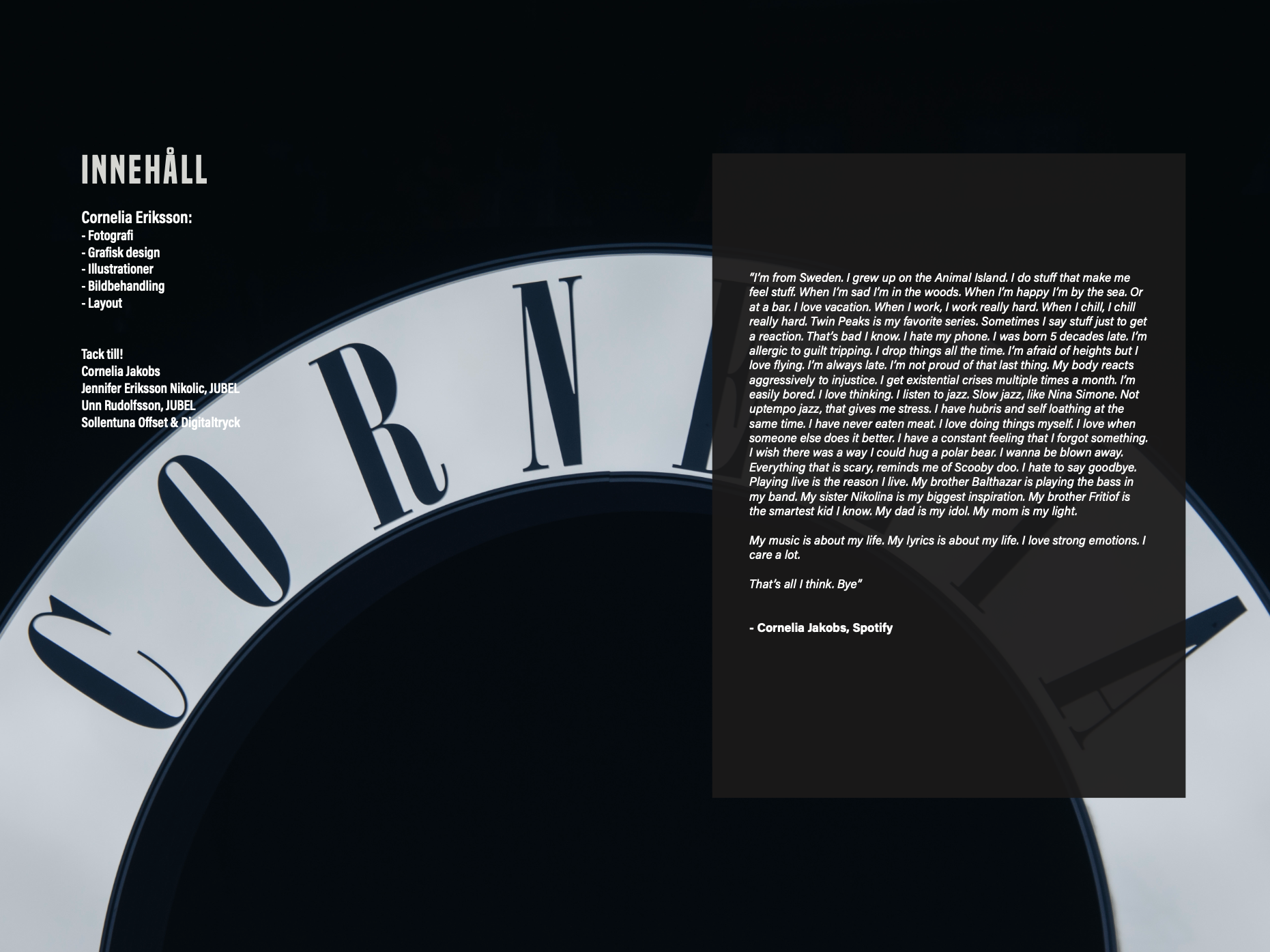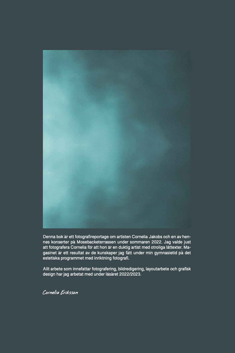Under sommaren 2022 fotograferade jag artisten Cornelia Jakobs på hennes konsert på Mosebacketerrassen i Stockholm. Utifrån detta material skapade jag ett magasin med ungefär 100 sidor i form av ett fotografireportage. Som blev ett större projekt under läsåret 2022/2023 på det estetiska programmet med inriktning fotografi.
