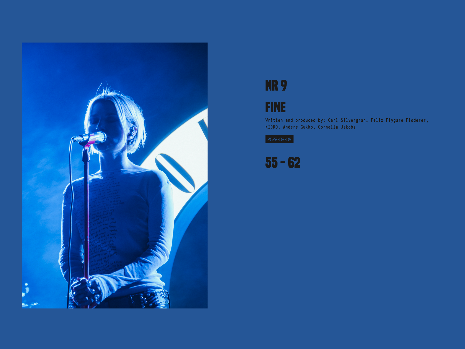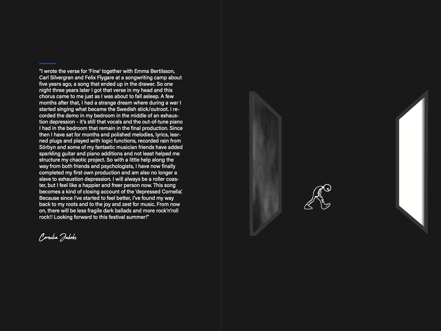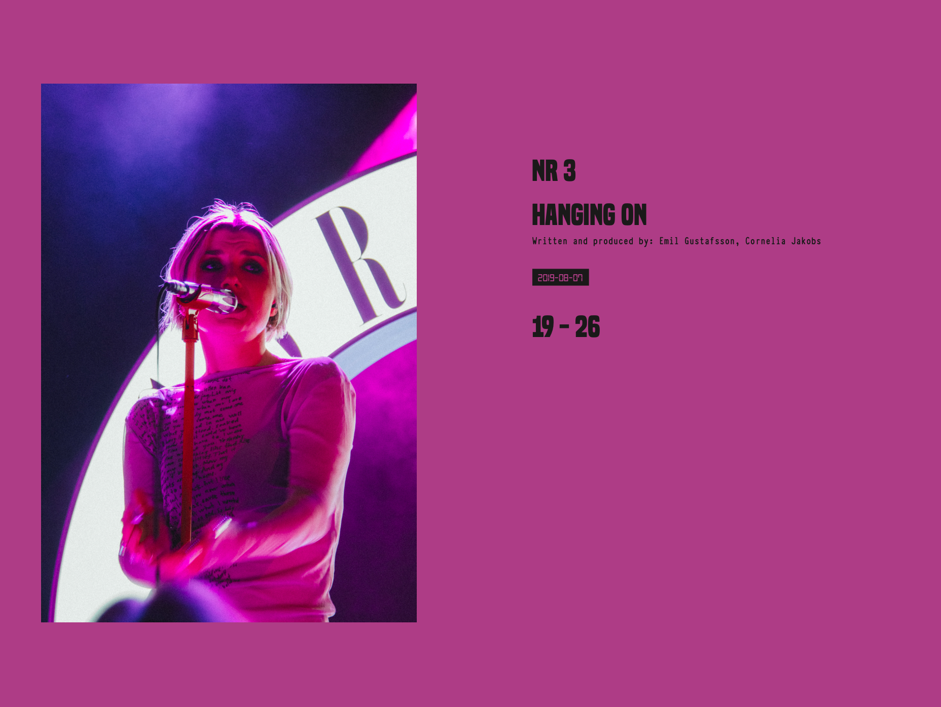 Under sommaren 2022 fotograferade jag artisten Cornelia Jakobs på hennes konsert på Mosebacketerrassen i Stockholm. Utifrån detta material skapade jag ett magasin med ungefär 100 sidor i form av ett fotografireportage. Som blev ett större projekt under läsåret 2022/2023 på det estetiska programmet med inriktning fotografi.