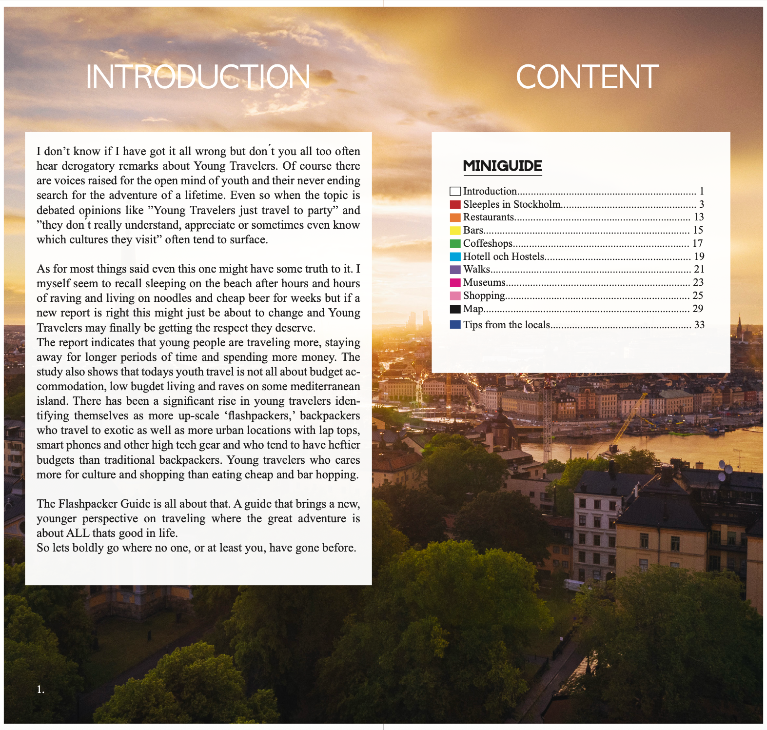 Skapade denna foldern i samband med en gymnasieuppgift där uppgiften var utformad så att jag fick fördjupa mina kunskaper i hur det kan vara att jobba med en folder/bok där fokus ligger på layouten. Uppgiften innefattade både layout av city/plats bilder och ett omslag till foldern/boken på Stockholm. Jag fick stor frihet i hur formen för omslaget och hur bilderna i publikationen kan se ut, så länge som jag höll mig till de givna förutsättningarna och formatet som finns (se nedan).
